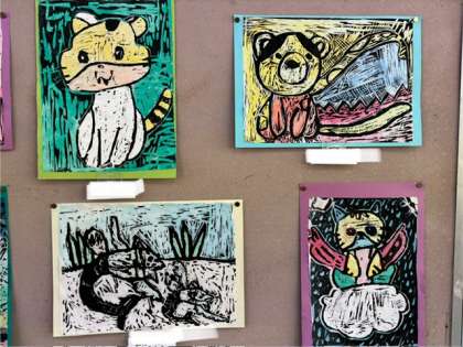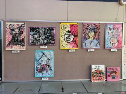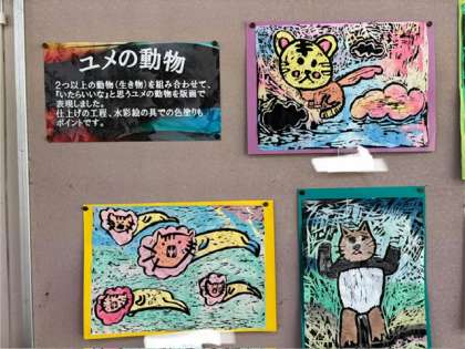 4年生の教室にとてもかわいい版画の作品が掲示されています。