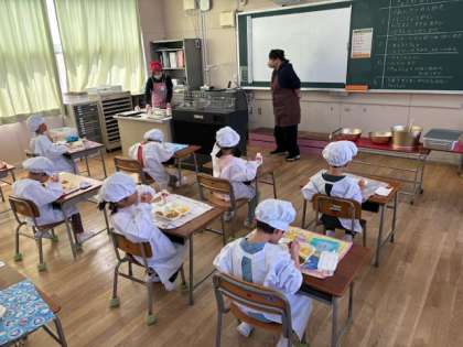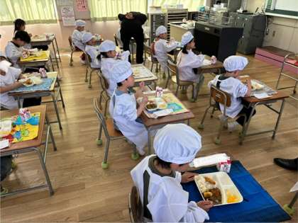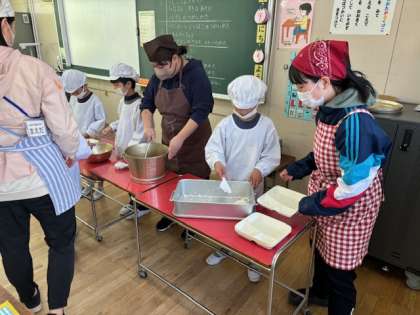 給食の献立は「入学お祝い献立」です。1.2年生で協力して準備します。しっかり食べてね。
