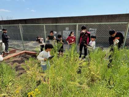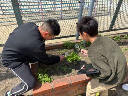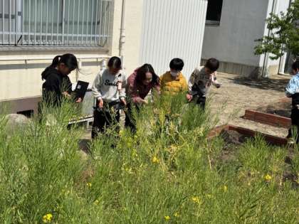 5年生が理科の時間に、虫メガネと端末を持って春の草花を観察していました。被子植物の典型「アブラナ」の学びにつなげます。