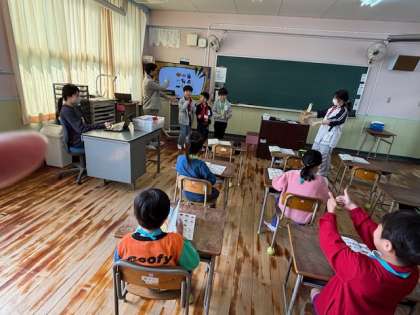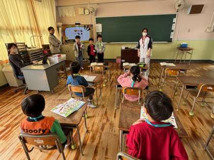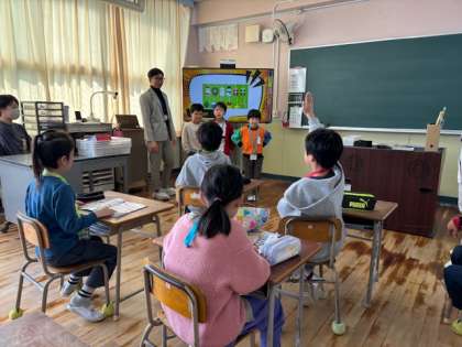 3年生の外国語活動です。モニターに映る絵をヒントを聞いてあてます。ヒントがいいとすぐに答えられていました。