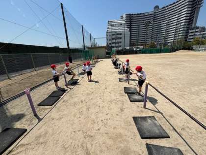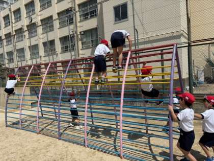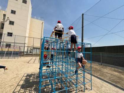 1.2年生は体育の時間に「固定遊具を使った運動遊び」をしていました。鉄棒にぶら下がったり、雲梯ですすんだりしていました。