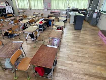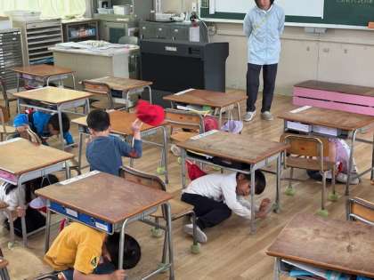 1年生には、初めての避難訓練です。地震を想定しているので、まず、机の下に避難して頭や体を守ります。