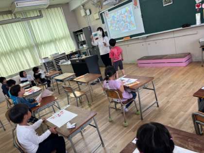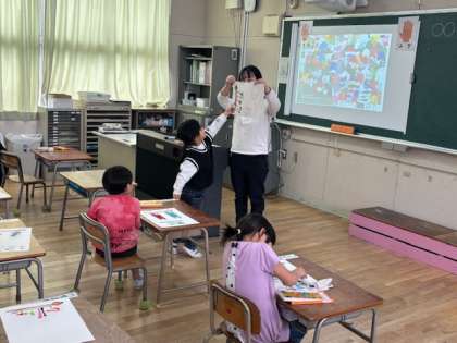 1.2年生は図工「おはなしからうまれたよ」で、〜のぼりを描いていました。キャンディやイカ、サメなど楽しい発想でかけています。