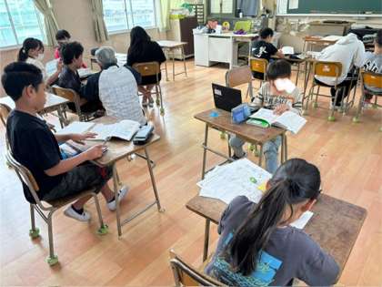 5年生の算数の時間です。プリント、問題集、デジタルドリルとさまざまな学習の道筋です。