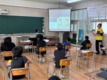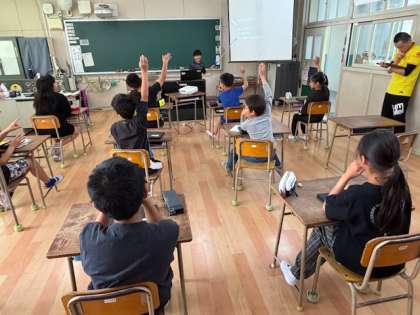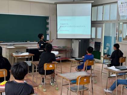 5年生が端末のスライドを使って研究発表をしていました。たくさんの先生に取材をして3択問題や報告などをしていました