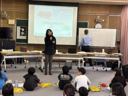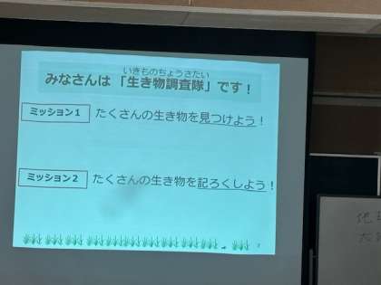 今日は、4年生が「生き物調査隊」になって校内の生き物を探します。虫や草花などたくさん探しましょう。
