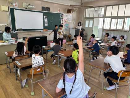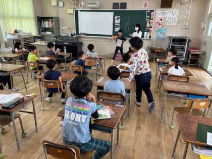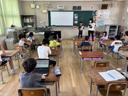 1.2年生の朝の会です。今日はなぞなぞの時間です。「わってもわってもゴミにならないものは?」