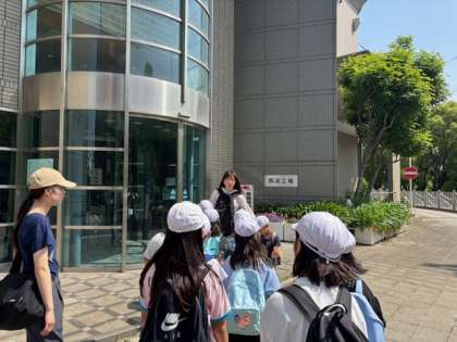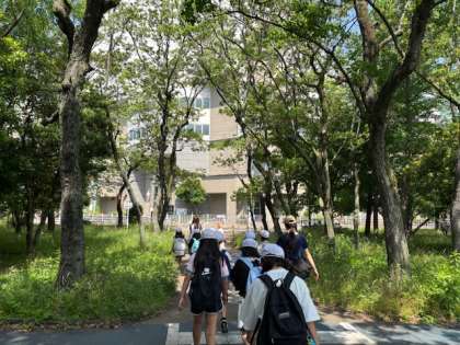 今日は4年生が社会見学で西淀焼却工場に来ました。緑いっぱいの場所を通り、到着しました。