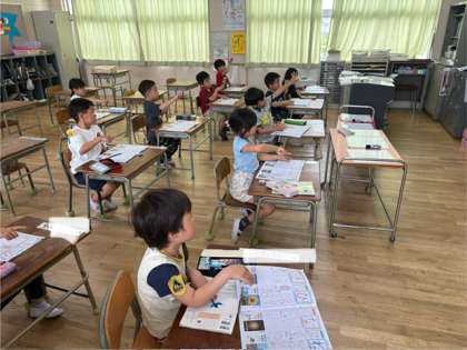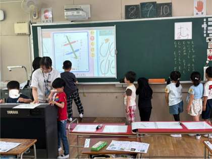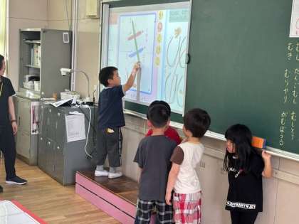 1年生がひらがなの学習をしていました。空中黒板に空がきをして、大きなスクリーンの字をなぞって、ホワイトボードに大きく書きます。指先だけでなく体で文字を覚えます。