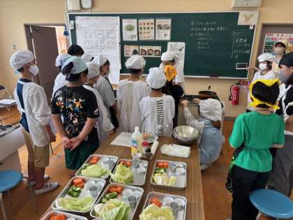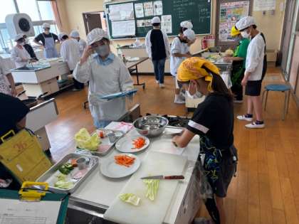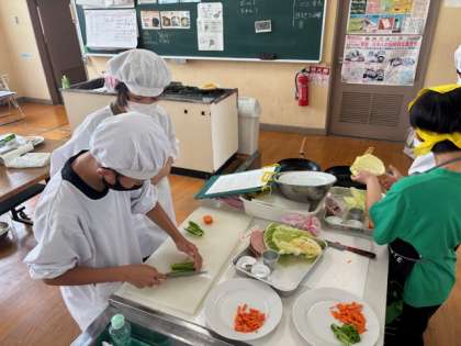 6年生が家庭科の調理実習をしていました。野菜を切ります。短冊切り、細切りをして油で炒めます。協力して頑張っていました。