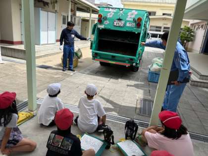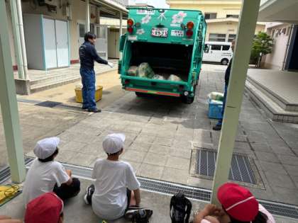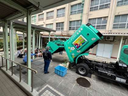 4年生が環境事業局の皆さんの出前授業を受けました。今日は、パッカー車がきてくれて、仕組みや動きを見せてもらいました。