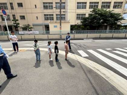 お話の後は、実際に学校から外に出て安全歩行訓練です。車や信号に気をつけて歩行します。