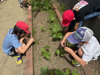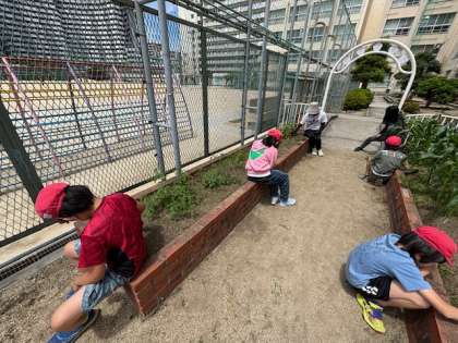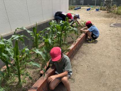 給食委員会のみんなが、学習園の雑草引きをしていました。トウモロコシ、ナス、ミニトマトの周りの雑草をとります。