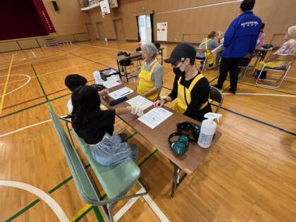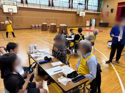 高齢者体験で、イヤーマフをつけて聞こえにくい状態にしたり、ゴーグルをつけて見えにくい状態にしたり、手袋で指先を使いにくくしたりして体験しました。