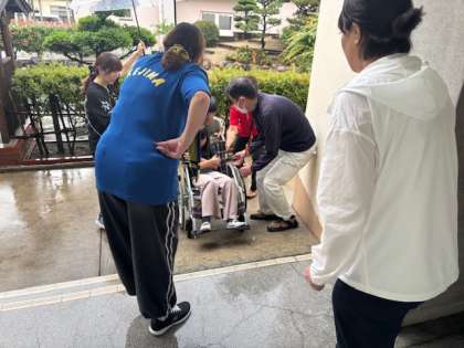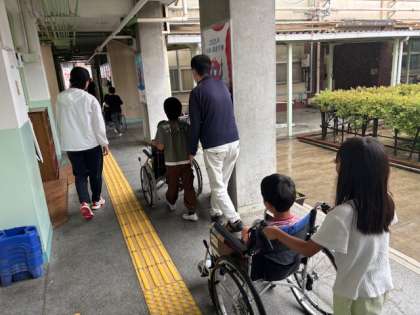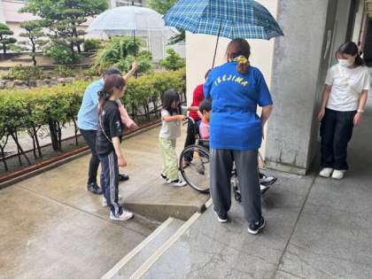 車いす体験では、雨のため廊下やスロープを使った体験をしました。何よりも声かけが大切です。