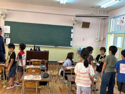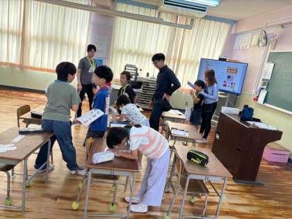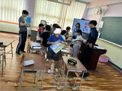 3年生の外国語活動です。英語のジャンケンをたくさんします。勝っても負けても引き分けでも印をつけられます。