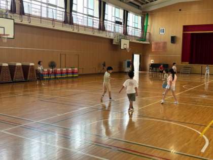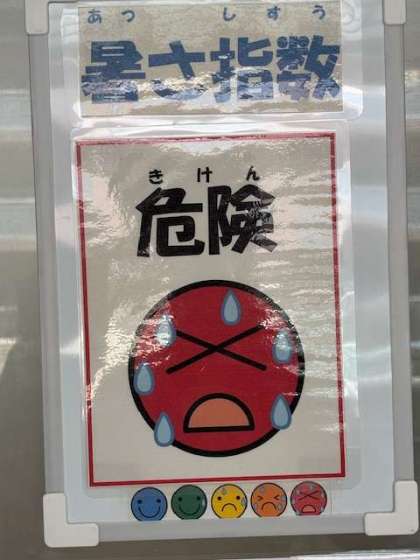 今日も運動場の熱中症計測器は危険を示しています。風通しの良い講堂で休み時間を過ごしています。