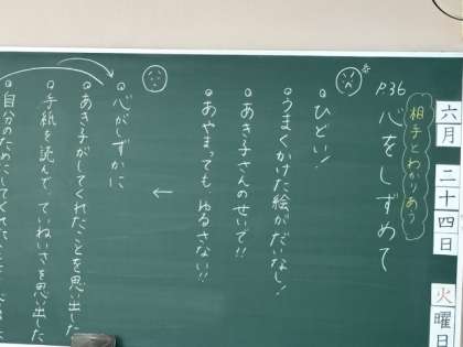 3年生が道徳の時間に「心をしずめて」という教材を読んで考えていました。友達の心を理解するためには、自分の心を見つめ直す必要がありますね。