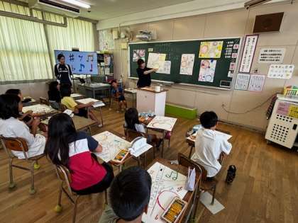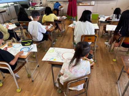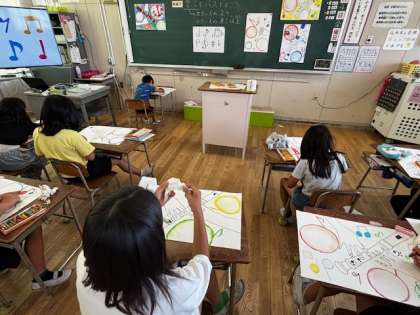 3.4年生が図工の時間に大きなリコーダーとリコーダーを演奏する手と音符を描いていました。音符の中には何が入るのかな?