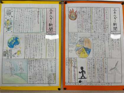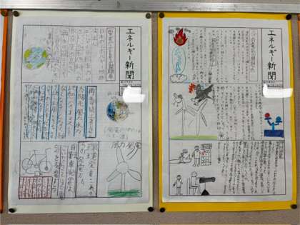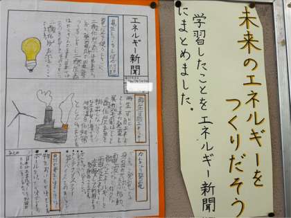 4年生が作成してきた「未来のエネルギー新聞」です。再生可能エネルギーについて考えられていますね。