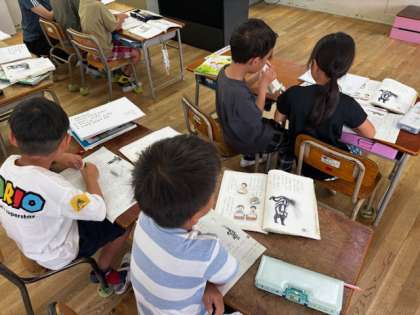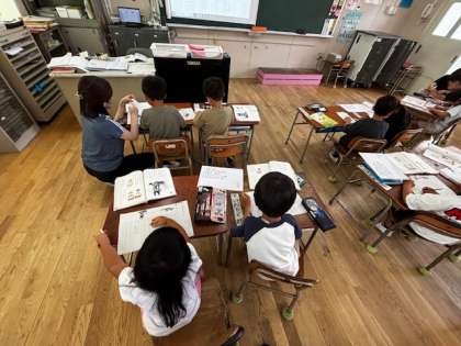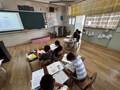1年生の国語の時間。今日はアルマジロやスカンクがどうやって身を守るのかを読み取ります。何回も音読して、教科書を読んで考えています。