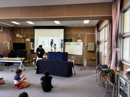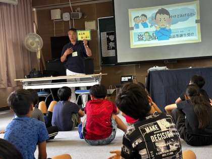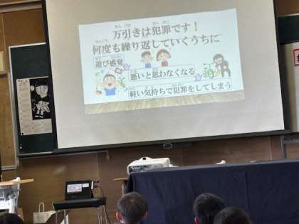 5年生が非行防止教室を受けました。最初に人形劇で万引き行為について学びました。そのあと、警察方から犯罪行為につながるようないろんな行動を教えてもらいました。