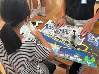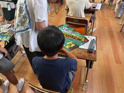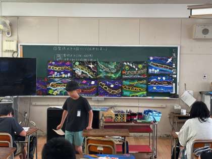 6年生の図工の作品が出来上がって来ました。黒板に並べているのをみるととてもきれいですてきです。