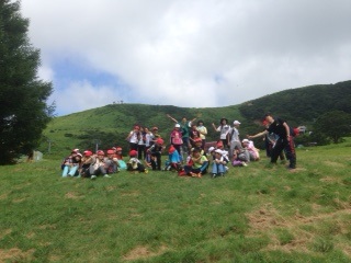 7月22日金曜日10時30分、5年生は高丸山を下山し、おやつにスイカをいただいています。