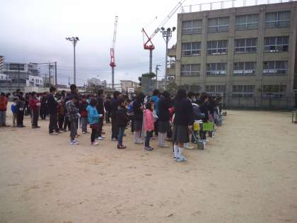 中学1年生と小学生が地区別に並んで「さぁ、やるぞ!」と、思っていた矢先に雨が…
