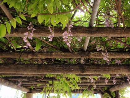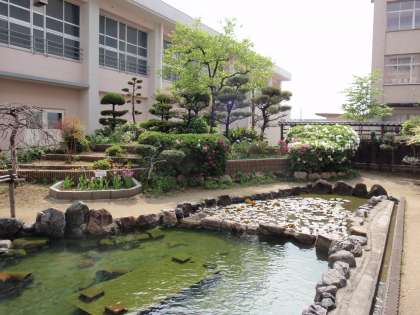子どもたちが休み時間に生き物の観察を楽しむ池の周りにはきれいなツツジが、校庭のすみの藤棚には少しですが、フジの花が咲いてきました。