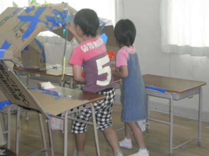教室いっぱいに作った迷路を進みます。途中で、宝物も隠されているよ!