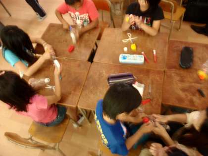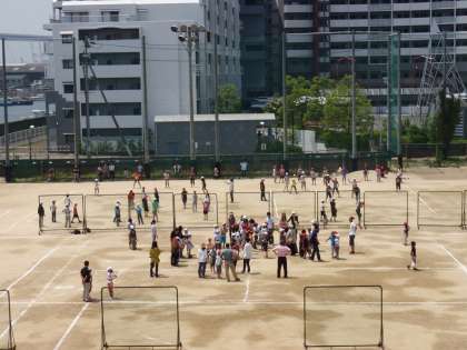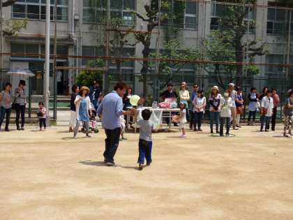 子どもたちの学習の様子を見ていただいた後は、保護者のみなさんとうちわで風船運び、ピンポン玉リレー、しっぽとり、、竹とんぼやブーメランなどの工作、、ドッジボールなどなど。