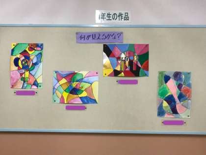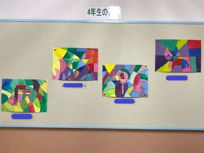 4年生の今回の絵画は、かくし絵になっています。水彩絵の具で丁寧に色を付けている中に何かの絵がかくれています。目を凝らしてよくご覧ください。