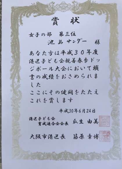 24日(日)港スポーツセンターで、港区子ども会親善春季ドッジボール大会が開催されました。池島小からもたくさんの選手が参加しました。中でも女子の部では、第3位という輝かしい成績を収めました。頑張った子ども達全員に、みんなから温かい拍手がおくられました。