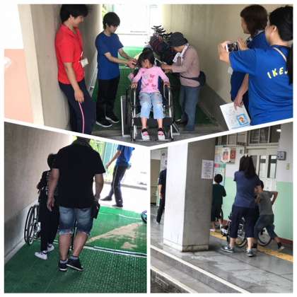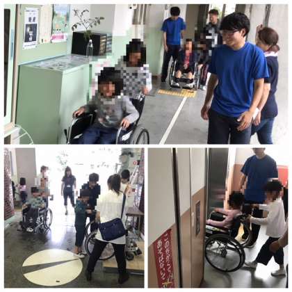 車イス体験では、2人1組で車イスに乗る人と介助する人に役割を交代しながら取り組みました。「進みます。」「後ろに行きます。」など声をかけて介助する方法を教わりました。