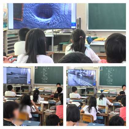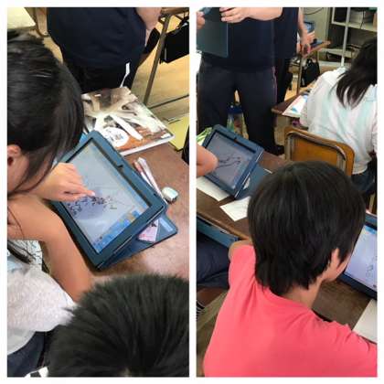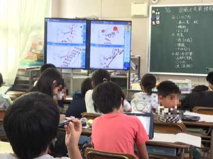 5年生の理科では、台風の進路を予想する学者をしました。巨大な台風の渦をみて、台風の影響について話し合いました。その後、台風の進路を予想して、タブレット上の地図に書き込みました。全員の予想を見合って実際の進路と見比べる学習に進みました。