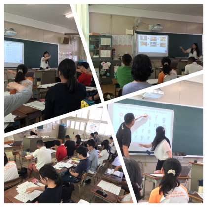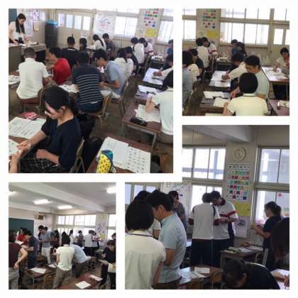 今年度から3年生以上で行うことになった外国語の授業。すでに1学期にも授業を行っていますが、2学期からの授業に備えて研修会を開催しました。八幡屋小学校の先生方も合同で、指導者の先生を招いて実技研修です。授業の進め方から、様々なゲーム、アクティビティと実際に体験しながら研修を受けました。