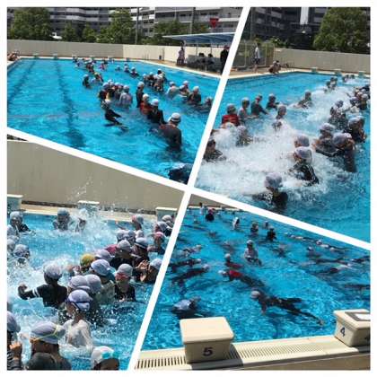 3時間目に、5.6年生合同で着衣水泳の授業をしました。はじめは普段通りに水の中を走りました。その後、服を着てから同じように走った時との違いを感じ、「無茶苦茶重い。」「走りにくい。」などと違いを感じていました。