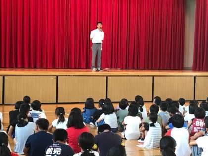 校歌斉唱、校長先生のお話の後、児童会の議長、副議長から1学期のみんなの様子について振り返りを発表してもらいました。その後、夏休みの暮らし、プール開放についてのお話もありました。健康に気を付けて楽しい夏休みにして欲しいです。