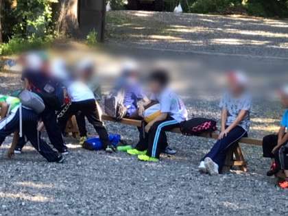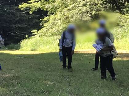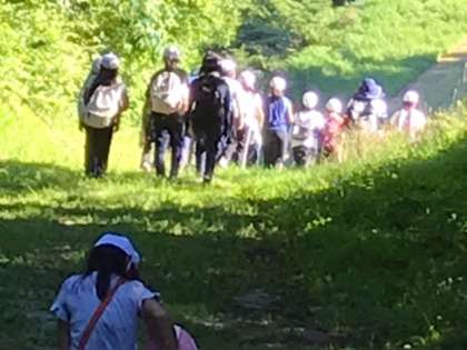山登りは辛い。でも、全員頑張っています。熱中症の心配があるので、休み休み登っています。