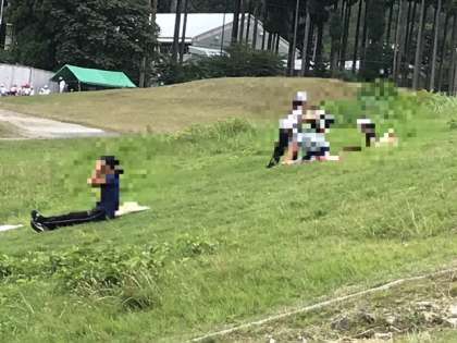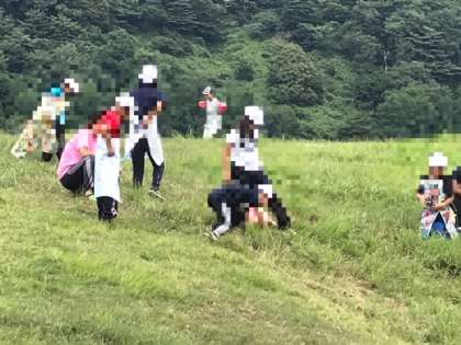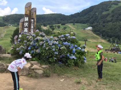 ハチ高原のモニュメントの前で記念撮影を終えて、しばらく高原遊びです。鬼ごっこや、草滑りをして遊びました。