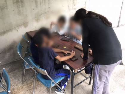 宿舎に戻り、ジュースを飲んだ後、昨日すすを落とした焼き板に色付けです。何をかこうかな?とみんな悩んでいましたが、みんなテーマは林間なので持って帰ってくるのを楽しみにしてください。