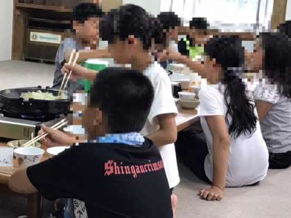 今日の晩御飯は、すき焼きです。割り下で味付けするのですが、日が強すぎてカラカラになっている班もありました。でも、今日から残さず美味しくいただきました。