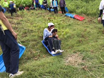 草の上のそり遊びは、なかなか楽しかったです。2人で力を合わせてそりを操らないと上手く滑らないので呼吸を合わせて頑張りました。