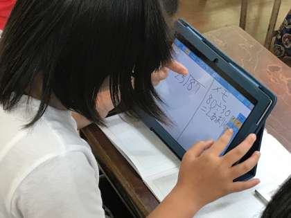 4年生が、算数「筆算の割り算」の研究授業をしてくれました。タブレットを使って、自分の考えた方法で問題を解いていきます。割り算を学ぶ上でとても大切なところの学習です。