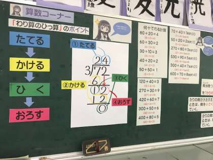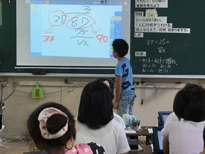 タブレットに書き込んだ自分の考えは、黒板に映し出し、みんなに考え方を説明します。背面黒板には、先生が、子どもたちの思考を助けるために丁寧な掲示物を作ってくれています。