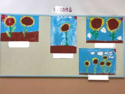 1年生がひまわりの絵をかいてくれました。雨の降っている日に元気が出そうなほど温かい絵です。青空もひまわりもパスの塗りこみをしっかりとできて、力強い作品に仕上がりました。