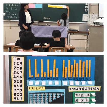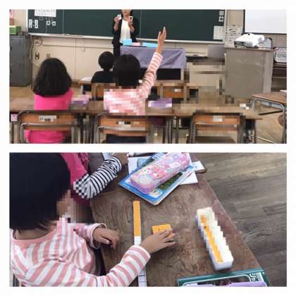 1年生が算数の研究授業をしました。くり上がりのある足し算のはじめの時間です。子ども達は、計算の仕方をブロックを使って考えて、発表しました。みんな意欲的に学習していました。