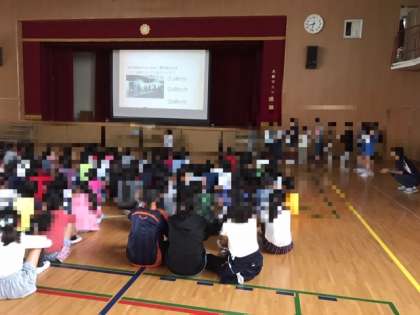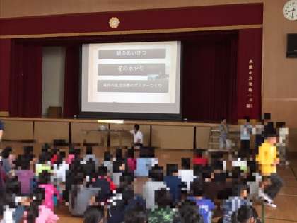 今日から池島ニコニコ週間です。朝登校時に元気にあいさつをしましょうと生活委員会の子供たちが声をかけます。集会では、生活委員会の仕事の説明や生活クイズを出してくれました。