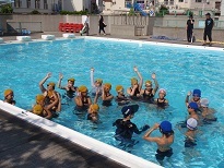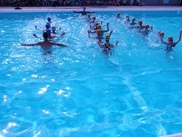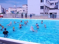 7月16日(水)に港中学校に元オリンピック選手の 巽 樹里さんによるシンクロナイズドスイミングの指導がありました。池島小学校からも子どもが参加し、普段の授業ではやらいような泳ぎ方のコツを教えていただきました。